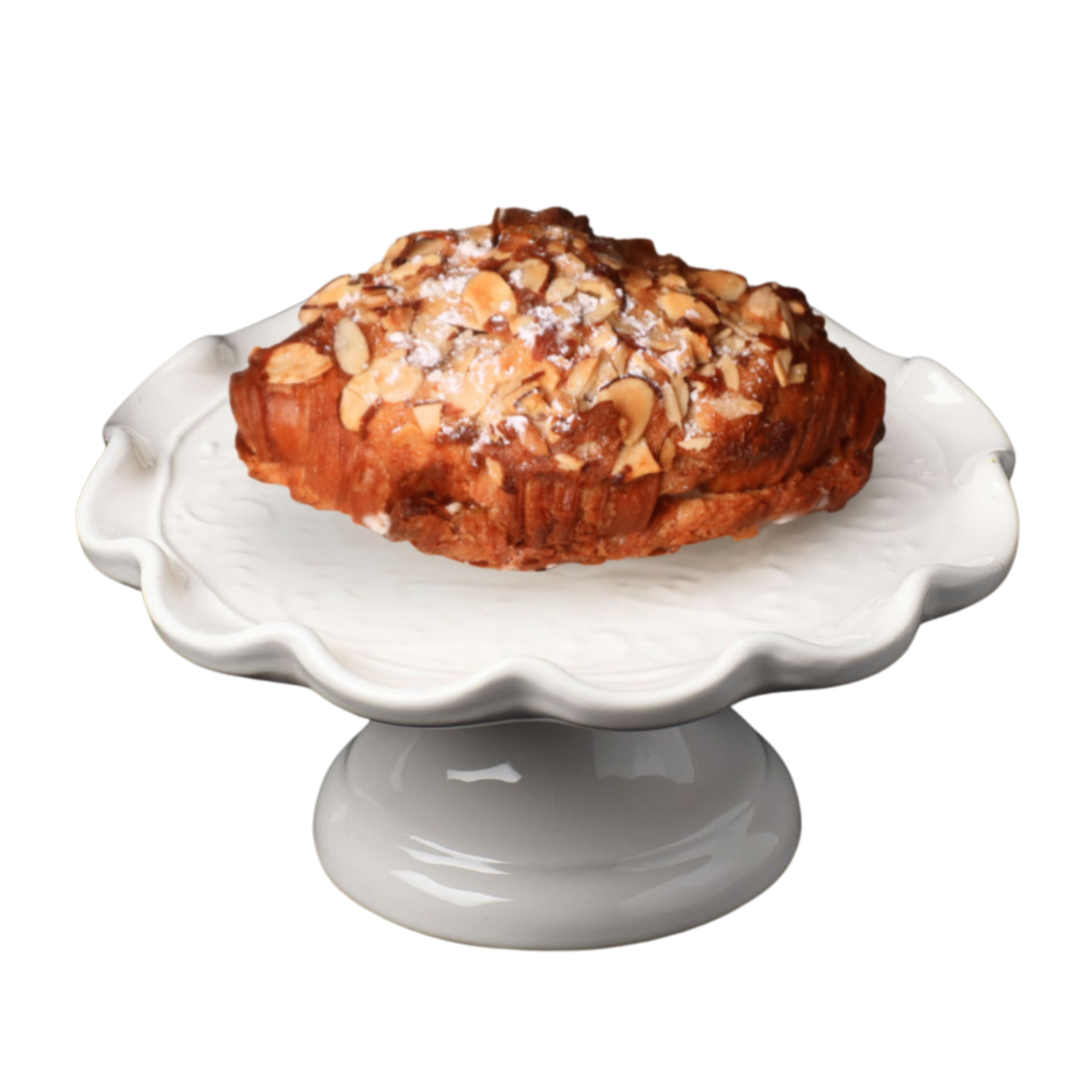 Junior-sized crispy croissant filled with almond paste, topped with powdered sugar and roasted almonds.